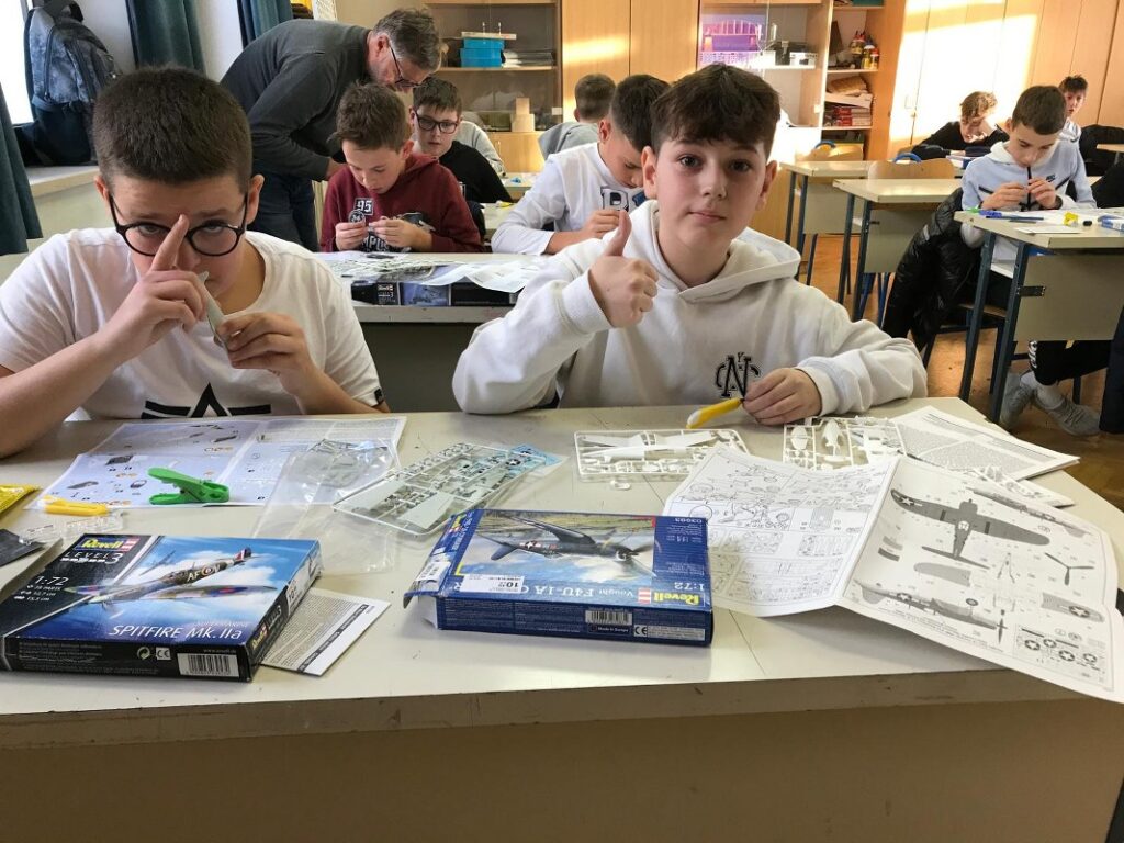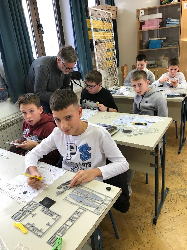 Naš član Srđan Gojak u suradnji s nastavnikom tehničkog odgoja gosp. Jarry Jelečom, održao je uvodno predavanje o plastičnom maketarstvu za 12 polaznika koji su, kao i uvijek, besplatno dobili makete zrakoplova.
